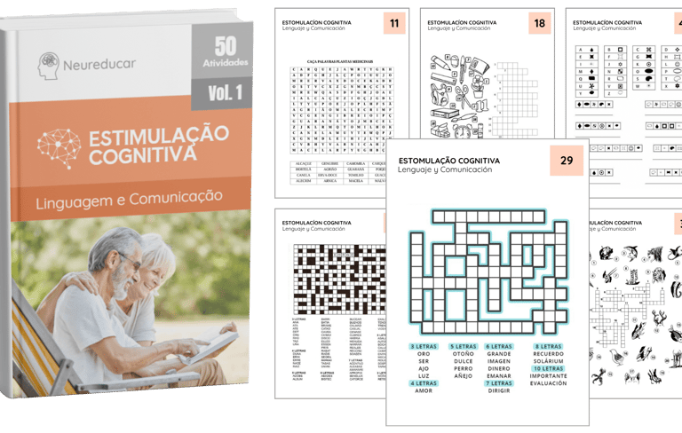 Exercícios com palavras, leitura e charadas. Eles estimulam o vocabulário e melhoram a comunicação, facilitando as interações sociais.